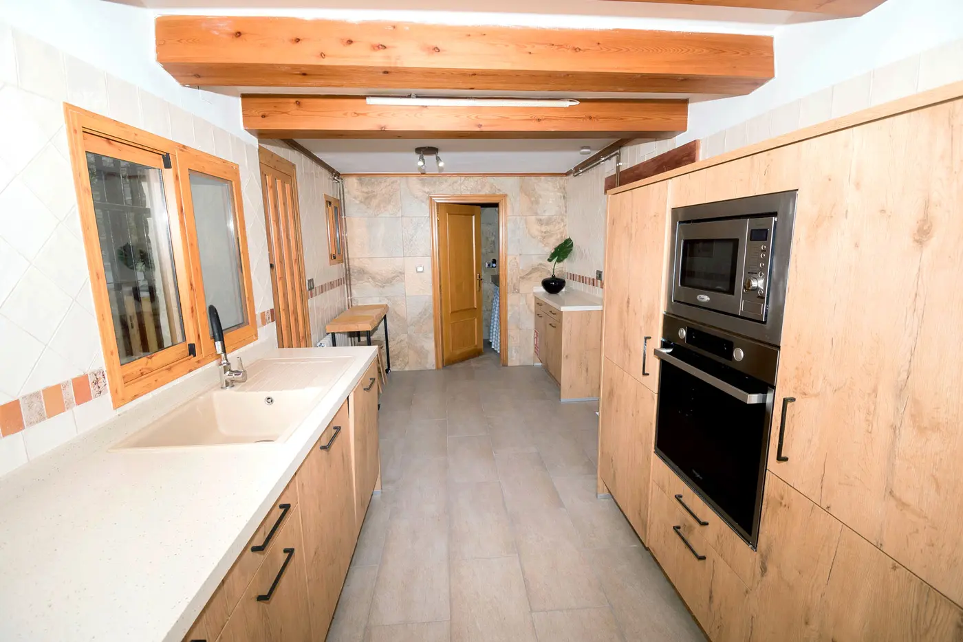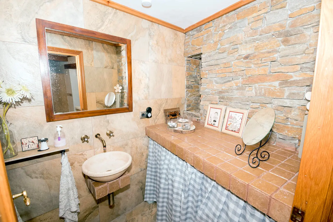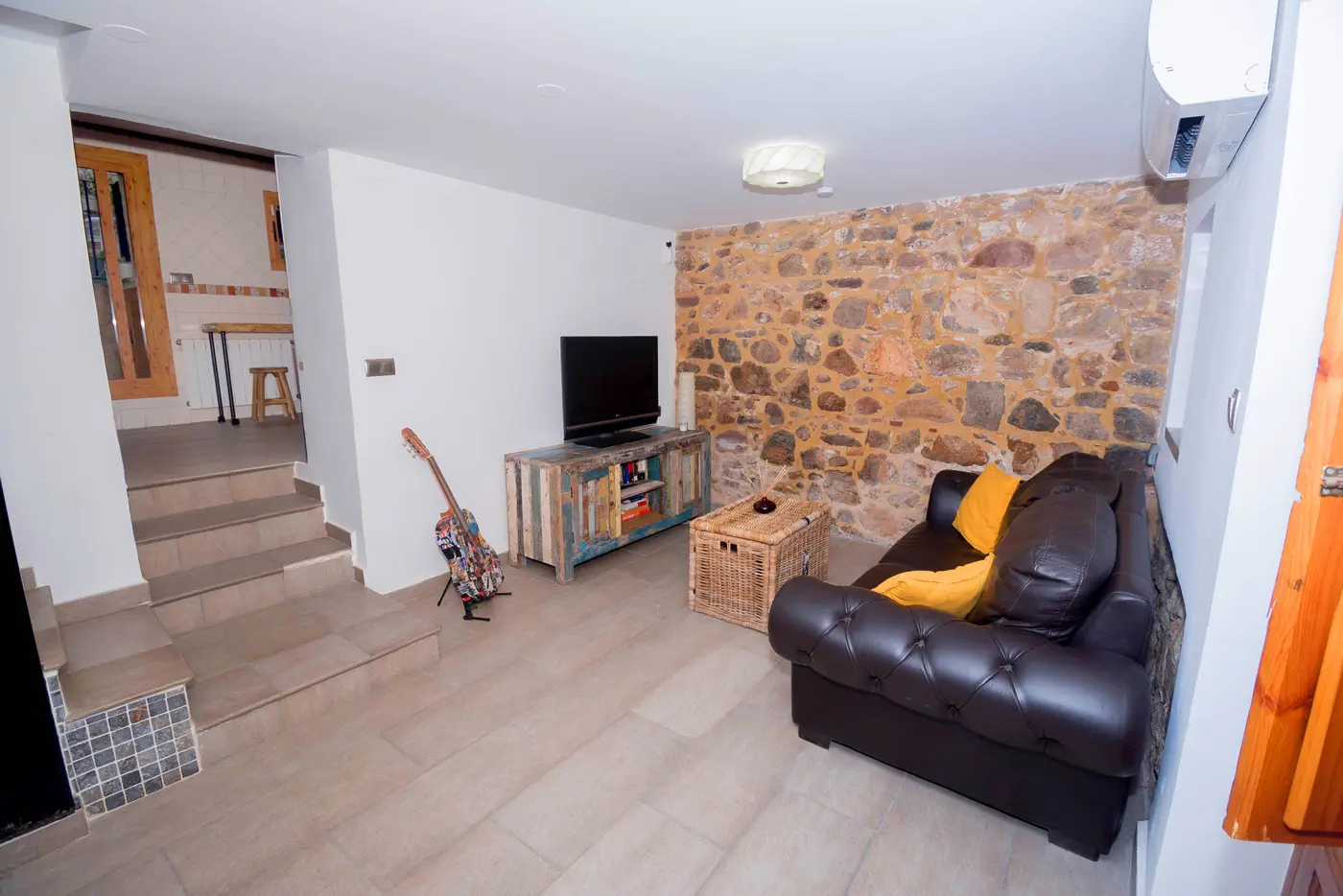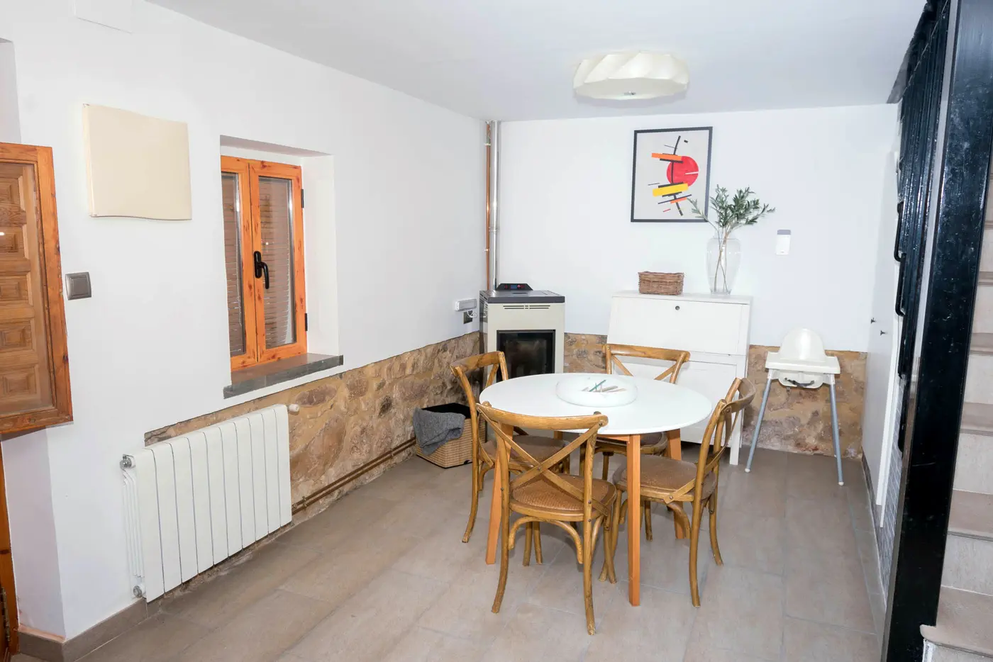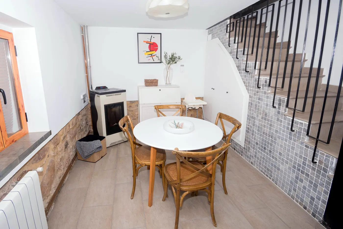 En la planta baja encontrarás un salón acogedor con pared de piedra vista, comedor luminoso y una cocina amplia totalmente equipada. Desde aquí se accede a la terraza privada, ideal para desayunar al aire libre o cenar al fresco después de un día de visitas.