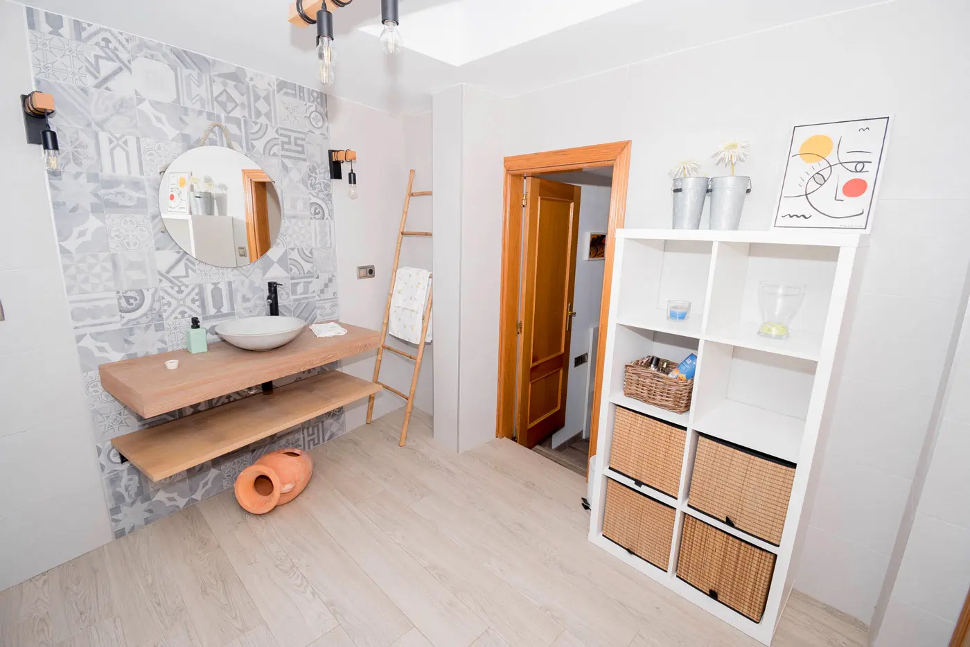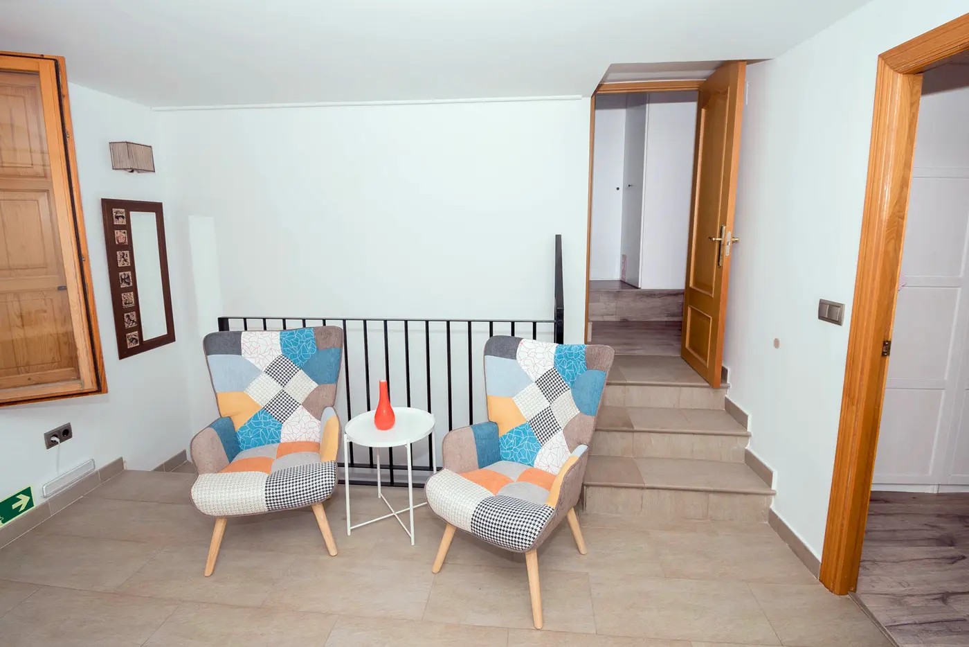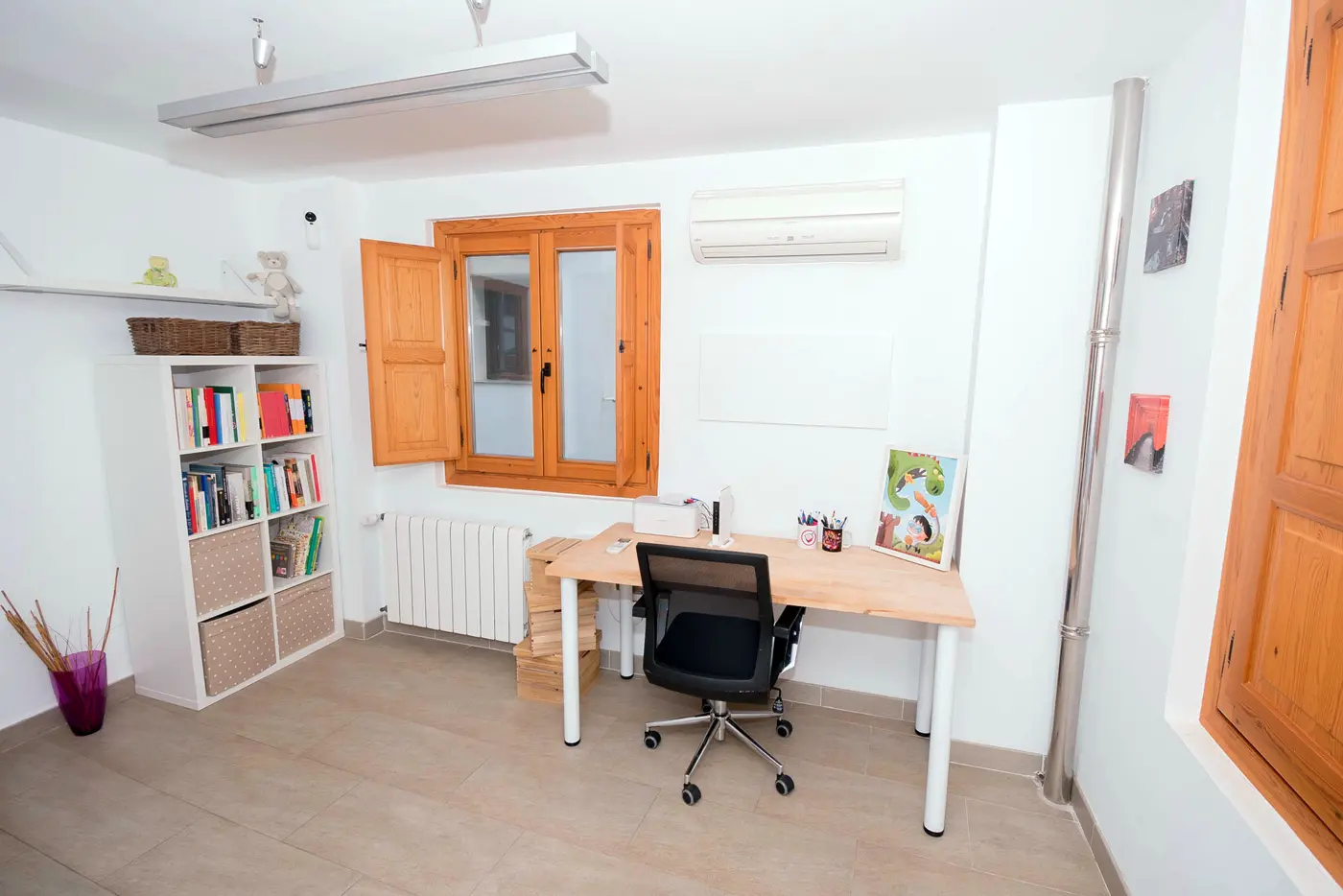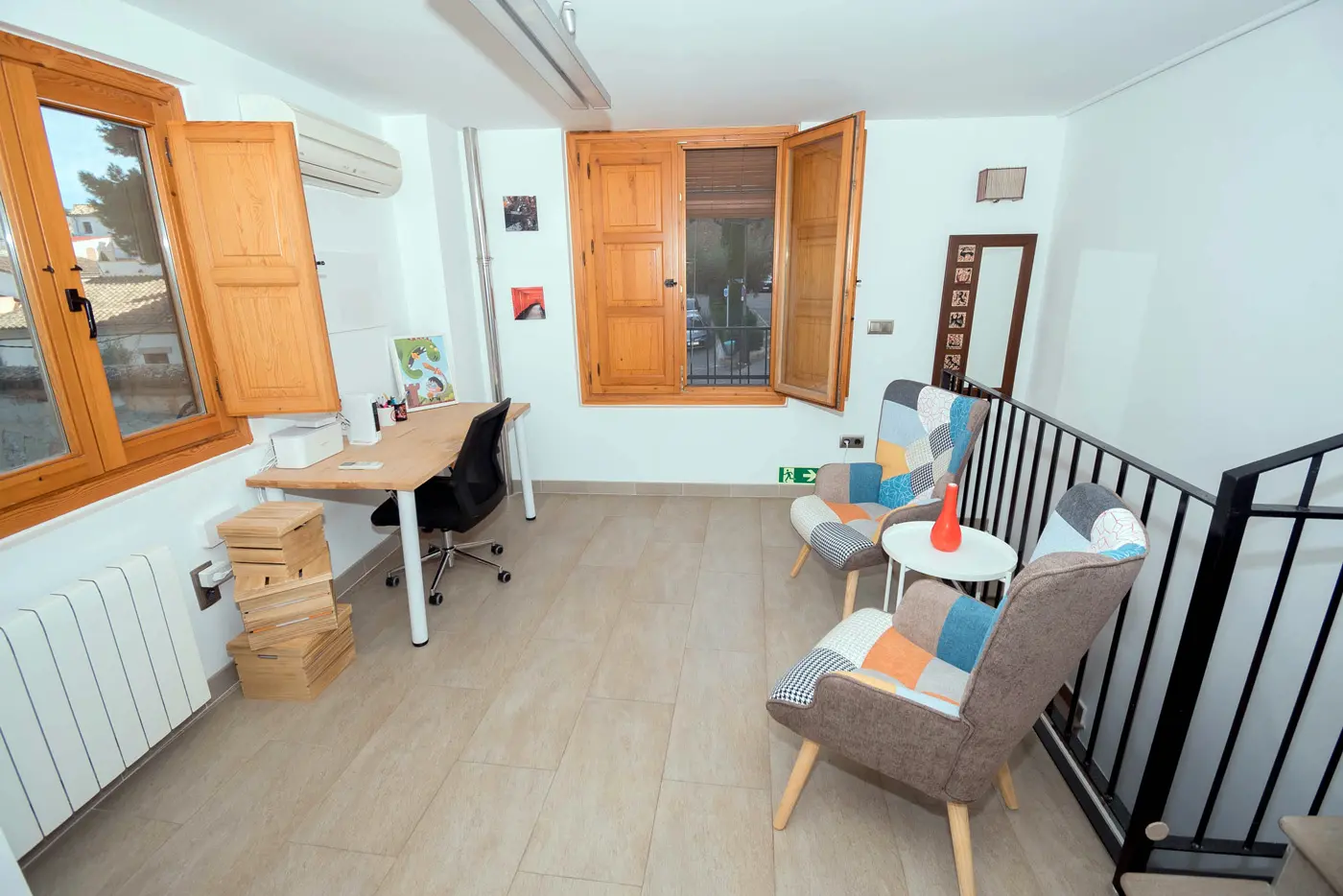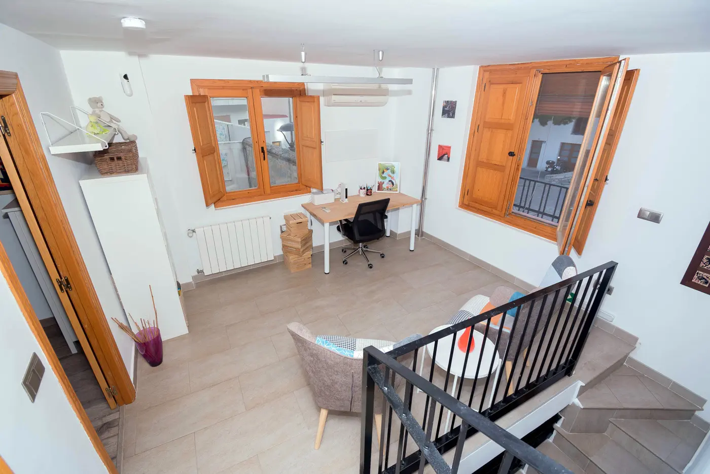En la planta superior se distribuyen los dos dormitorios, un estudio perfecto para teletrabajar y un baño completo. La casa está preparada para estancias en familia, escapadas de fin de semana o viajes más largos.